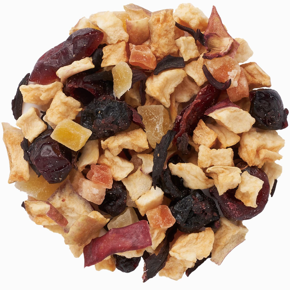 有機ドライアップル(オーストリア製造)、加糖ドライパパイヤ、加糖ドライマンゴー、加糖ドライクランベリー、加糖ドライブルーベリー、有機ハイビスカス、/香料、クエン酸、保存料(亜硫酸塩)
