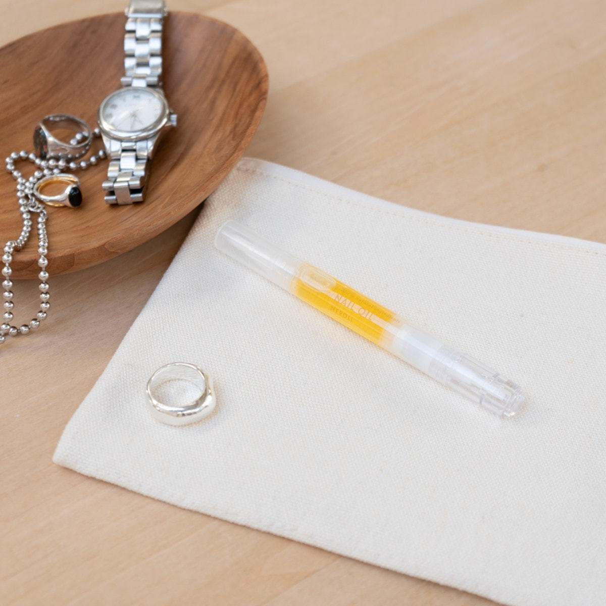 2.オイルが筆に浸み出たら爪、甘皮周り、指先にオイルを塗布します。