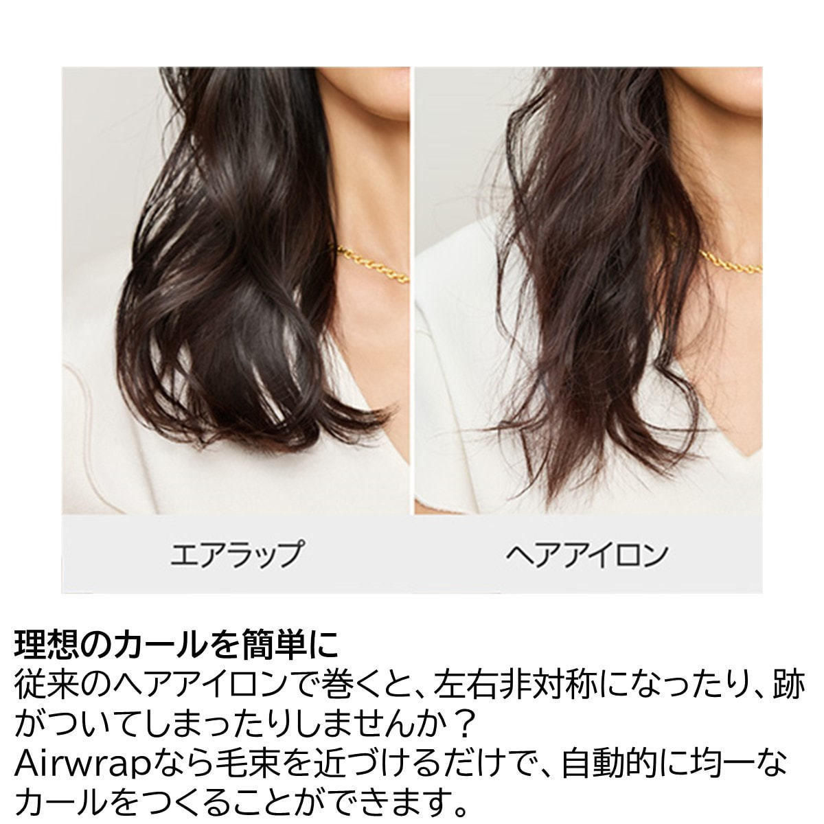 大きめのエアリーカールをつくります。アタッチメントの先(クールチップ)を回転させるだけで、内巻きと外巻きのカールをつくることができます。